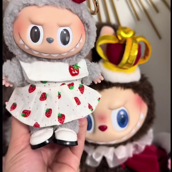 Featuring a cute strawberry-print dress, embroidered strawberry patch, and an oversized red bow, this doll is full of personality. Its playful expression and detailed outfit make it stand out as both a toy and a collectible.